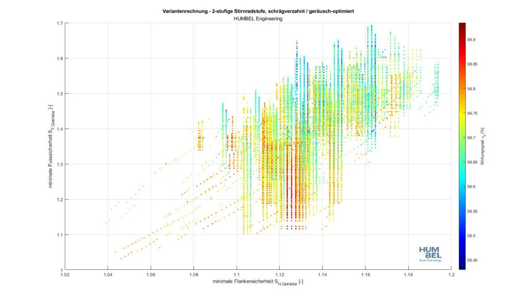 Using our proprietary engineering tools, we can customize and apply comprehensive variant calculations specifically for your project. This system can analyze billions of gear geometry variations, evaluating each against your specific requirements – whether that’s weight, space envelope, efficiency, or acoustic performance. Rather than offering off-the-shelf solutions, we identify the mathematically optimal design for your exact application.